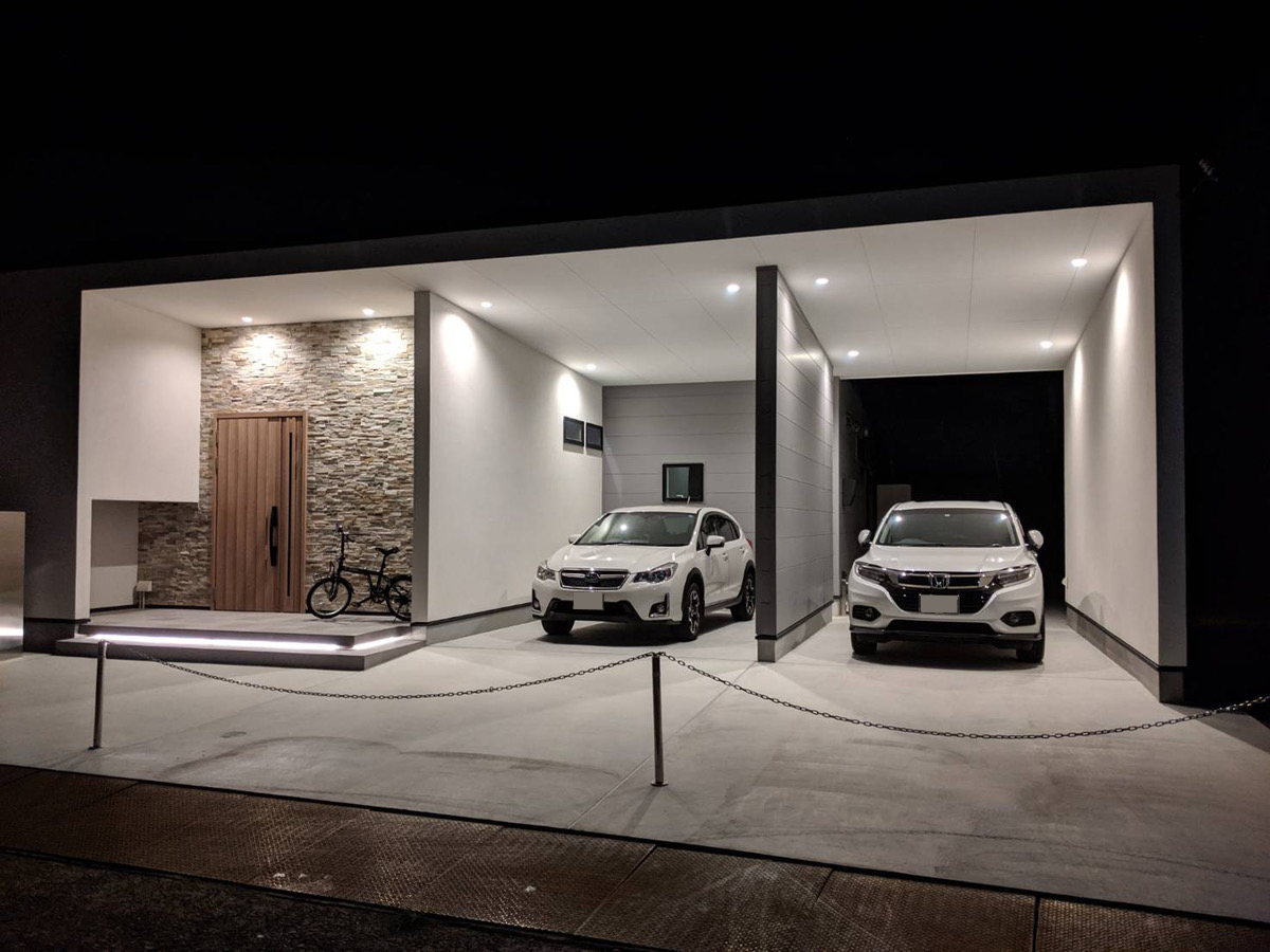 自然に囲まれたガレージのある平屋